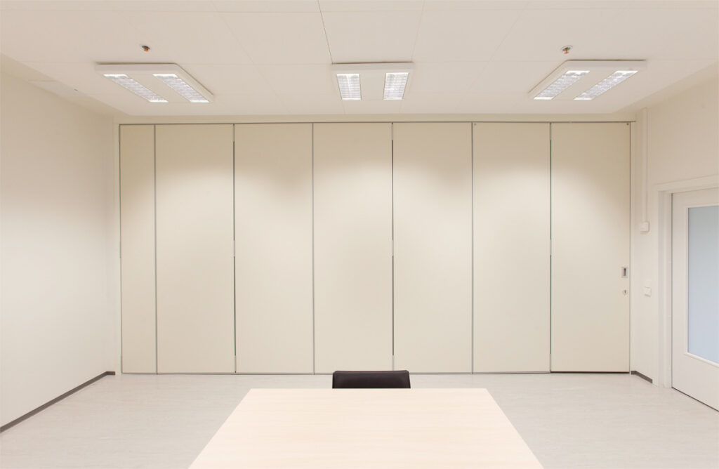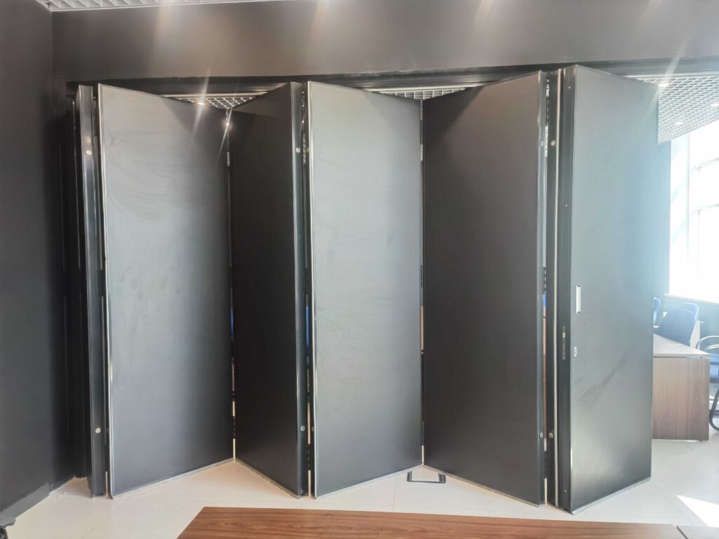 В закрытом положении раздвижная перегородка – это гладкая стена. Части перемещающейся перегородки крепятся между собой петлями. По периметру каждый сегмент укомплектован мягкими резиновыми уплотнителями. Последний сегмент раздвижной перегородки – дверь.