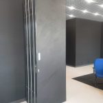 Появился новый тип раздвижных перегородок – это мягкая раздвижная перегородка еще ее называют перегородка из кожзама. Итак что же из себя представляет мягкая раздвижная перегородка – это жесткий каркас обтянутый мягкими и экологически чистыми материалами (эко кожа, искусственная кожа импортного производства, антибактериальные материалы), сохраняя при этом достаточно хорошую звукоизоляцию и очень высокую прочность.