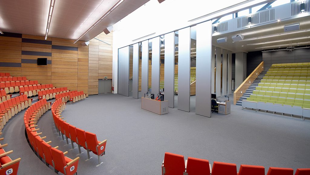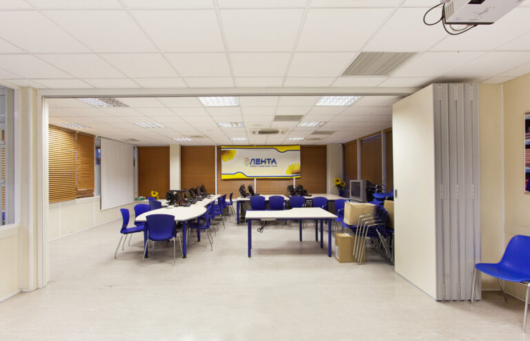 Раздвижная стена – это звукоизоляционная конструкция, состоящая из отдельных не связанных между собой сегментов (панелей), каждый сегмент (панель) обрамлен высококачественным анодированным алюминиевым профилем. Перемещаются сегменты с помощью системы шарикоподшипниковых роликов по направляющим и складываются в так называемой “парковке”. Раздвижные стены (также их еще называют раздвижная перегородка) имеют только потолочное крепление, это облегчает перемещение сегментов и позволяет избежать ненужного “порога” в полу, который может испортить ваш внешний интерьер помещения.